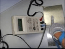 5.2.5.3 將帶有待測手套的手指逐一按壓在金屬板上,待讀數(shù)穩(wěn)定后 讀取讀數(shù)并記錄。